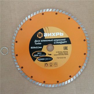 - Диск алмазный отрезной Турбо СТАНДАРТ, 230 х 22,2 мм, сухая резка Вихрь по выгодной цене 880 р. руб.;