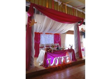 Потресающее ощущение празднику придадут роскошное оформление зала для свадьбы,и в этом мы рады вам предложить:различную драпировку тканью,объемные буквы,чехлы с различным декором,шар-сюрприз,свадебную флористику.