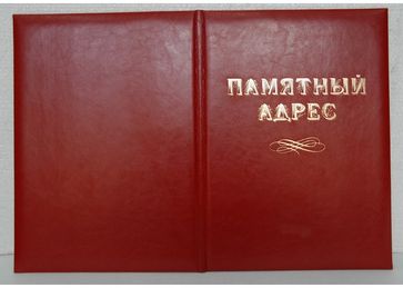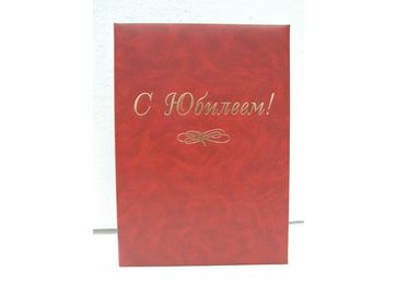 Папка из бумвинила с выклейкой из ВХИ и тиснением "Памятный адрес", картон "Kappa" 2 мм с поролоном, с декоративными металлическими уголками под золото. Также возможен более дорогой вариант - использование кожзама или кожи различных цветов. Можем предложить тиснение фольгой "С Юбилеем!", а также разработать поздравительный вкладыш, который вкладывается в папку и крепится под ляссе.