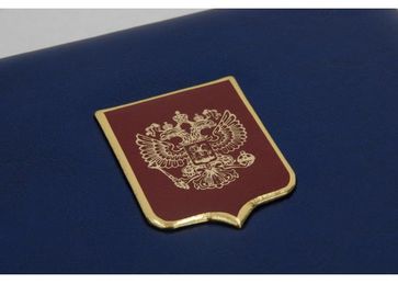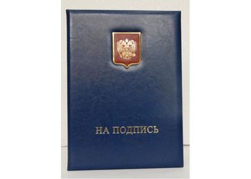 Папка на подпись с накладным гербом и тиснением под золото, толщиной 25 мм. Выполнена из кожзама итальянского производства, внутри синий бархат. Возможен выбор цвета,тиснения и вариант из натуральной кожи.