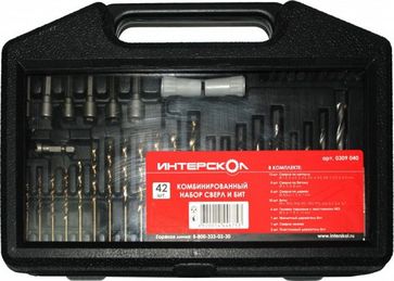 Набор Интерскол комбинированный 42 предмета Комбинированный набор 42 предмета. Сверла по металлу, дереву, бетону, биты, головки торцевые с хвостовиком HEX, сверло-зенкер, магнитный держатель, пластиковый держатель бит, кейс. Минимальная сумма заказа 999.00 руб.