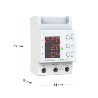 Многофункциональное реле RBUZ MF предназначено для защиты однофазной электросети от недопустимых отклонений напряжения, а также превышения потребления тока и активной мощности. С его помощью вы можете ограничивать потребляемую активную мощность подключенного оборудования. Реле действует по принципу отсекателя: при превышении установленных значений отключает нагрузку. Категория продукции: Многофункциональное реле Ток, А: 50 Способ монтажа: На DIN-рейку Количество фаз: 1 ф. (230 Вольт) Термозащита: Есть TrueRMS: Есть Проф. задержка отключения: Есть Нижний предел напряжения: 120-210 В Верхний предел напряжения: 220-280 В Номинальная мощность нагрузки: 11 000 ВА Время отключения нагрузки при снижении напряжения: 176-210 В - 10 с, 164-176 В - 0,5 с, ниже 164 В - 0,04 с Время отключения нагрузки при превышении напряжения: свыше 264 В - 0,04 с, 220-264 В - 0,5 с Основной предел тока: 0,1-50 А Ограничение активной мощности: 0,1-11 кВт Точность измерения силы тока: 5-50 А ±0,1 А, 1-5 А ± 0,2 А, <1 А ± 0,3 А Номинальный ток нагрузки: 50 А (макс. 60 А в течение 10 мин.) Время задержки включения нагрузки: 3-600 с Время задержки выключения нагрузки: 0-240 с Тип реле: Поляризованное Напряжение питания: 100-420 В Сечение провода: не более 16 мм² Масса: 0,21 кг ±10 % Габаритные размеры (Ш х В х Г): 53 х 85 х 70 мм Количество коммутаций под нагрузкой, не менее: 50 000 циклов Количество коммутаций без нагрузки, не менее: 500 000 циклов Степень защиты по ГОСТ 14254: IP20 Мощность, ВА: больше 10 000 Комплект поставки: реле, гарантийное свидетельство, гарантийный талон, технический паспорт, инструкция, упаковочная коробка Наличные, Visa/Mastercard/МИР, б/н расчет, кредит. Можно купить без предварительного заказа. Возможен самовывоз. Есть доставка.