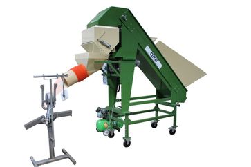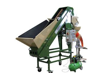 оборудование машина для фасовки упаковки картофеля и овощей УД-5 с клипсатором -предназначена для автоматического взвешивания и расфасовки овощей (картофель, лук, морковь, свекла, корнеплоды, цитрусы) в сетку чулок (клипсатор), готовые сетчатые, мешки, пакеты. Взвешивающий бункер загружается овощами с помощью ленточного транспортера с лотками. На Установке фасовочной установлено два транспортера (основной «широкая лента» и до загрузочный «узкая лента»). До загрузочный транспортер «узкая лента» служит для того, чтобы при взвешивании не было большой погрешности. Погрешность при взвешивании в 1 продукт. Взвешивание обеспечивается высокоточным электронным определителем веса (тензодатчик). Величину веса устанавливает оператор (от 1 кг. до 5 кг. с клипсатором и от 1 кг. до 50 кг. в готовые сетки). Продукт высыпается в сетку чулок либо готовые сетки, мешки, пакеты. Установкафасовочная УД-5 комплектуется пневматическим клипсатором (упаковка сетка-чулок с лентой ручкой) для более полной автоматизированной работы для розничной упаковки (упаковка от 1 кг. до 5 кг.). Для работы в комплекте с клипсатором необходимо наличие компрессора (минимально 6 атмосфер). Установка фасовочная может использоваться для работы как в линии по переработке и предпродажной подготовки овощей, так и в автономном режиме (отдельной машиной).