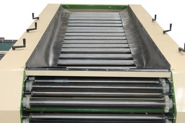 Во время движения расстояние между роликами увеличивается, продукт проваливается на ленточный транспортер.