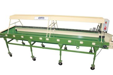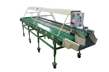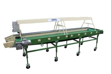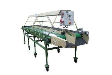 стол ленточный инспекционный (сортировочный переборочный стол) для переборки картофеля и овощей КРИ-10-01 -предназначен для ручной инспекции овощей (картофель, лук, морковь, свекла, фрукты). Некачественные (подгнившие, нестандартные, битые и т д.) овощи помещаются в разделитель, находящийся в центральной части конвейера, откуда автоматически попадают на отводящий наклонный транспортёр или в специальную тару (контейнер). Качественные овощи перемещаются далее по линии по переработки овощей или отводятся для упаковки в сетки, мешки, пакеты (сетка-держатель на 4 сетки). В зону сортировки овощи подаются автоматически с помощью вращающей гладкой ленты. Сортировочный ленточный стол установлен на колёсных опорах (мобильный). Имеется плавная регулировка конвейера по высоте. На Сортировочном столе установлен частотный преобразователь для регулировки скорости движения ленты. Имеется освещение по желанию заказчика (входит в стоимость стола). Сортировочный стол изготавливается в двух вариантах: 1. С сетка-держателями на 4 сетки, 2. С выгрузным лотком.