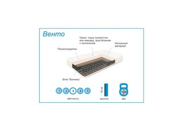 Матрас средней жесткости "Венто" на основе пружинного блока "Боннель". Модель обеспечивает надежную поддержку позвоночника во время сна и комфортный отдых. Оптимальный вариант для дачи или гостиной.