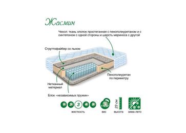 Двусторонний матраc "Жасмин" средней жёсткости линейки "Зима - Лето". Прослойка из струттофайбера с волокнами льна придает модели дополнительную упругость, а разный состав сторон матраса позволяет использовать его круглый год: хлопковую сторону летом и сторону с шерстью мериноса зимой.