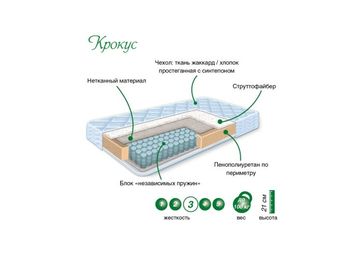 Матрац "Крокус" как раз для тех, кто не определился, какая жесткость ему подойдет. Это средний вариант между моделями "Лелия" и "Колеус" в серии "Калверо". Иновационный материал струттофайбер с обеих сторон в сочетании с блоком "Независимых пружин" придадут необходимую поддержку Вашему позвоночнику во время сна.
