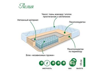 Применение пенополиуритана в качестве наполнителя делает матрац "Лелия" одним из самых недорогих в линейке матрацев на основе блока "независимых пружин". Модель обладает хорошей поверхностной и объемной упругостью. Рекомендуемая максимальная нагрузка в расчете на одного человека не должна превышать 100 килограммов.