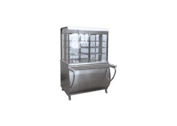Прилавок-витрина тепловой электрический кухонный типа ПВТ, предназначен для кратковременного хранения в теплом состоянии мелкоштучных хлебобулочных и кондитерских изделий и пищевых продуктов на тарелках,функциональных емкостях, подносах, и раздачи их потребителю. Внутренний объем витрины обогреваются теплым воздушным потоком или паром, поступающим из ванны, воздух или вода в которой нагревается ТЭНами. Для равномерного распределения температуры и влажности воздуха в витрине прилавка установлен вентилятор. Витрина оборудована лампами подсветки, имеет регулируемые по высоте ножки.
