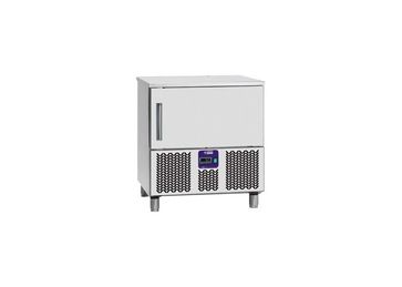 Шкаф шоковой заморозки Diamond GTP-5P, 5 уровней GN1/1, t охлажд. +70...+3°С=12кг, эл. упр., щуп, 790х700х900мм, 1.21кВт, 220ВШкаф шоковой заморозки Diamond GTP-5P устанавливается на кухнях ресторанов, кафе, столовых и других предприятий общественного питания для быстрой заморозки готовых блюд, полуфабрикатов и сырых продуктов (ягод, фруктов, кукурузы, стручковой фасоли, нарезанных овощей). В процессе шоковой заморозки тормозится рост бактерий, что предотвращает порчу продуктов. Полезные вещества, витамины и, что немаловажно, вкус и аромат продуктов сохраняются в течение всего срока хранения. Шкаф шоковой заморозки Diamond GTP-5P вмещает 5 уровней GN1/1 или 5 обычных противней площадью 600х400 мм. Камера шкафа рассчитана на загрузку 12 килограммов продукта. С помощью встроенного электронного регулятора температуры оператор может устанавливать нужное значение охлаждения. Одна партия ингредиентов охлаждается с +70 до +3°С всего за 90 минут.Корпус и дверца шкафа изготовлены из нержавеющей стали AISI 304. Корпус расположен на четырех ножках, высоту которых можно регулировать. В камере шкафа шоковой заморозки данной модели находятся вентиляторы, которые препятствуют высыханию сырых продуктов и готовых блюд. Наличие вентилятора также позволяет обеспечить равномерную температуру на разных уровнях камеры. В камере шкафа шоковой заморозки имеется микровыключатель, останавливающий работу вентиляторов во время открывания дверцы шкафа. Это позволяет свести к минимуму количество теплопритоков из воздуха в помещении в камеру шкафа. Шкаф шоковой заморозки Diamond GTP-5P комплектуется термощупом, с помощью которого можно быстро определить текущие показатели температуры замораживаемого продукта. Для выработки низких температур используется хладагент R134A, который признан безопасным для окружающей среды. Размораживание камеры и испарение конденсата осуществляется автоматически.Габариты790х700х880/900 мм