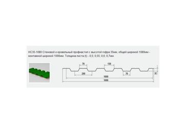 НC35-1080 Стеновой и кровельный профнастил с высотой гофра 35 мм, общей шириной 1080 мм - монтажной шириной 1000 мм. Толщина листа (t) - 0,5; 0,55; 0,6; 0,7 мм.