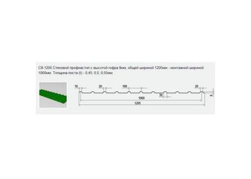 С9-1205 Стеновой профнастил с высотой гофра 9 мм, общей шириной 1205 мм - монтажной шириной 1060 мм. Толщина листа (t) - 0,45; 0,5; 0,55 мм.