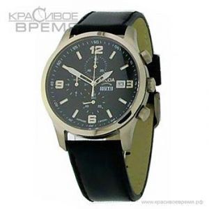Особенности:Часы-хронограф с секундомером. Люминесцентные стрелки. Кожаный ремешок. Индикация числа. Диаметр корпуса 40 мм.