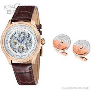 Особенности:Набор из часов и запонок. Механические часы с автоподзаводом ES-8039-04. Скелетон. Секундная стрелка вынесена на отдельный циферблат. Корпус выполнен из нержавеющей стали с IP покрытием. Кожаный ремень. Диаметр корпуса 40 мм. Запонки ES-003-C3. Выполнены из нержавеющей стали c IP покрытием. Диаметр 20 мм.