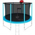 Clear Fit ElastiqueHop Basketball 14ft Батут с баскетбольным щитом диаметром 14ft (426 см) Технические характеристики: . Тип защитной сетки: внутренняя . Рама: высококачественная гальванизированная сталь 42 х 1,5 мм . Ножки W-формы: 4 шт (стальные трубы 38 x 1,3 мм) . Система крепления рамы и опор: T-образный кронштейн (толщина стали 2,05 мм) . Материал прыжкового полотна: Permatron . Диаметр прыжкового полотна: 3,8 м . Ширина защитного мата: 40 см . Количество слоев защитного материала: 3 шт . Материал верхнего слоя защитного мата: PVC . Мягкий центральный слой защитного мата (толщина EPE): 20,45 мм . Материал нижнего слоя защитного мата: PE material . Материал сетки: 100% polyethylene (PE) . Вход: усиленная молния, дополнительная защита открывания . Количество пружин: 88 шт (гальванизированная сталь) . Длина пружин и толщина стальной нити: 165 x 3,1 мм . Количество верхних стоек: 8 шт (стальные трубы 25 x 1,2 мм) . Материал внешнего слоя обшивки стоек: PVC . Внутренний (мягкий) слой обшивки стоек (толщина EPE): 7,5 мм . Лестница: - количество ступеней: 3 ступени - ступень (ширина, глубина): 34 х 3,5 см - профиль (диаметр, толщина): 2,5 х 0,12 см - материал лестницы: сталь - высота лестницы: 110 см . Антикоррозионное покрытие труб конструкции: двойная оцинковка . Баскетбольный щит: полипропилен (75 х 51 см), со специальным стальным крепежом для установки на батут . Кольцо: сталь в мягком материале с сеткой . Сертификат качества: CE, GS, ISO 9001 . Цвет: - обшивки стоек: бирюзовый - защитного мата: бирюзовый . Артикул: cfeh_14ft_basket . Гарантия: 1 год . Торговая марка: Франция . Страна изготовления: Китай . Максимальный вес пользователя: 200 кг В комплекте: . Батут . Защитная сеть . Лестница . Баскетбольный щит с креплением . Баскетбольное кольцо с сеткой . Баскетбольный мяч с насосом . Набор ключей для сборки . Инструкция на русском языке Размеры и вес в упаковке: - 1 упаковка: 170 х 38 х 15 см / 39 кг - 1 упаковка: 140 х 38 х 13 см / 26 кг