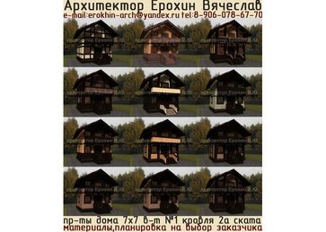 Каталог проектов. Эскиз проекта по вашим пожеланиям БЕСПЛАТНО. Любые стили и виды (Шале, фахверковый, деревянный, кирпичный и др.) , планировки на выбор. Понравившийся проект дом 7x7 Вы можете заказать из оптимальных для вас материалов (фундамент, стены, кровля), выбрать конструктивную систему. Любые виды отделки на Ваш выбор (визуализация БЕСПЛАТНО). Стоимость проекта – 30 000р. Т.8-906-078-67-70 erokhin-arch@yandex.ru
