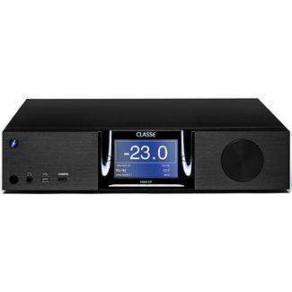 7.1-канальный AV-процессор/предусилитель Classe Sigma SSP относится к самой младшей серии в модельном ряду компании. Аппарат оптимизирован для работы в режиме стерео, а также демонстрирует превосходное качество звучания в многоканальной системе. Невысокий изящный корпус AV-процессора можно установить в студийную стойку (в комплект входят соответствующие крепления). В центр фасада под небольшим углом встроен сенсорный LCD-дисплей, который показывает уровень громкости, вход, декодер и др., позволяет выполнять настройки через меню и просматривать видео в режиме Preview. Рядом с дисплеем расположена кнопка входа в меню и кнопка для приглушения громкости. Правую часть фасада занимает «утопленная» ручка громкости/баланса. Слева находится асинхронный USB (совместим с iPod/iPhone/iPad), порт HDMI, 6,3 мм гнездо для наушников и кнопка питания/standby. Бортовой сигнальный процессор базируется на чипе Texas Instruments. При необходимости апгрейда плату с DSP можно легко заменить. Модель умеет работать с такими востребованными форматами окружающего звука, как Dolby TrueHD и DTS-HD Master Audio. Поддерживается функция AirPlay для беспроводного получения аудио от устройств на базе iOS. Имеется поддержка DLNA-стриминга. При подключении по локальной сети через Ethernet-порт становятся доступными аудиофайлы компьютеров и серверов. Данный AV-процессор выступает в роли медиа-рендерера (не имеет собственного плеера, занимается только обработкой сигнала). Аппарат оснащен задающим тактовым генератором, который превосходит по характеристикам генератор, встроенный в Ethernet-модуль, что положительно отражается на качестве звучания. Доступно управление Classe Sigma SSP с помощью приложения для мобильных устройств, через IP-адрес или ПДУ. Аппарат позволяет задать до шести различных профилей конфигурации АС, что удобно для решения разных задач – прослушивания музыки в стерео, просмотра фильма с 7.1-канальной дорожкой и т.д. Каждый канал имеется 9-полосный параметрический эквалайзер. Присутств
