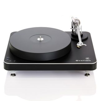 В проигрывателе виниловых дисков Ovation компания Clearaudio реализовала много существующих передовых технических решений, а также новые технологии. Шасси проигрывателя имеет сендвич-структуру, и состоит из двух алюминиевых плит, между которыми расположен фанерный лист очень высокой плотности. Эта фанера изготавливается методом прессования из древесины под очень высоким давлением, и становится в буквальном смысле слова пуленепробиваемой. Но и этого инженерам компании показалось недостаточным для достижения полной акустической инертности шасси, поэтому в нем была сделана специальная полость, заполненная 100 тысячами маленьких стальных шариков. В результате шасси проигрывателя Clearaudio Ovation не только эффективно подавляет все вибрации и резонансы, которые могут возникнуть при работе механизма вертушки, но и те, которые могли быть наведены извне.Не менее оригинально инженеры компании решили и задачу размещения двигателя, который хотя и спрятан внутри шасси, но полностью механически развязан от него. С вала двигателя вращение передается на алюминиевый суб-диск, а затем на опорный диск из композитного материала на основе акрила. Также в вертушке применен фирменный прецизионный подшипник CMB, шкив которого изготовлен из полированной керамики, а корпус из синтерированной бронзы.Проигрыватель имеет все три стандартные скорости вращения диска. Для их стабилизации в проигрывателе Clearaudio Ovation используется фирменная технология OSC (Optical Speed Control), которая постоянно контролирует вращение диска с помощью стробоскопической ИК-системы. Для управления работой проигрывателя предназначены четыре подсвечивающиеся кнопки в правой части корпуса.Проигрыватель опирается на виброизолирующие опоры, и легко выравнивается на любой поверхности. На Clearaudio Ovation можно установить любой стандартный тонарм длиной 9 дюймов. Внешне аппарат выглядит очень стильно, благодаря изящно скругленным углам корпуса, и продуманному минимализму внешнего оформления.Особенности винилового п
