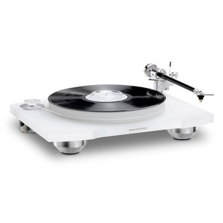 Виниловый проигрыватель TT-15S1 был создан брендом Marantz в соавторстве с уважаемой германской компанией Clearaudio Electronic. Компонент относится к фирменной серии Premium. Прототипом послужила популярная модель Clearaudio Emotion.При первом же знакомстве Marantz TT-15S1 впечатляет своим великолепным утонченным дизайном. Устойчивое к резонансам изящное белое акриловое основание с фигурным вырезом в передней части и логотипом Marantz установлено на три массивные регулируемые алюминиевые ножки, развязывающие его с поверхностью. Опорный диск толщиной в 30 мм, изготовленный из акрила GS-PMMA, обработанный на станках с программным управлением и оснащенный фетровым матом, использует для своего вращения высокоточный керамический подшипник. В наборе также имеется специальный прижим Clever Clamp фирмы Southern Engineering, надевающийся на ось шпинделя для того, чтобы надежно зафиксировать виниловую пластинку. Благодаря этому также улучшается звуковое разрешение. Полностью отделенный от корпуса асинхронный двигатель переменного тока находится в стальном футляре с круглыми ножками и вставлен в расположенное в левой части стола отверстие так, чтобы не касаться его краев. На один из двух блоков шкива мотора надевается прочный бесшовный силиконовый пассик, передающий вращательный момент на опорный диск. Переключение между скоростями в 33,3 или 45 об/мин осуществляется ручным методом путем перебрасывания пассика на соответствующий блок. Опционально доступен стандарт в 78 об/мин, но для этого необходимо будет приобрести отдельный дополнительный шкив. На кожухе двигателя есть кнопка включения и гнездо для подсоединения кабеля питания.Модель оснащена добротным MM-картриджем Clearaudio Virtuoso с корпусом из эбенового дерева. Прямой тонарм Clearaudio Satisfy выполнен из анодированного алюминия, обладает широким спектром регулировок и оснащен магнитной системой антискейтинга. Имеется встроенный качественный межблочный кабель и заземляющий провод.Звучание проигрывателя можно охаракте