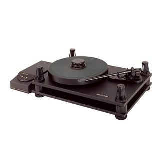 SME Model 20/12 занимает верхнюю позицию в предтоповой линейке проигрывателей винила британской компании SME Limited, широко известной благодаря своим высококачественным тонармам.Этот 33,5-килограммовый аппарат с уверенностью можно назвать референсным. В нем учтена практически каждая деталь, которая может повлиять на звучание. Благодаря большому весу и оригинальной конструкции сдвоенного стола, изготовленного из алюминиевого сплава, о вибрациях и резонансах можно забыть. Нижняя платформа SME Model 20/12 снабжена четырьмя регулируемыми ножками, в которые вложены стальные шары для контакта с поверхностью (вместо шаров можно выбрать обычные накладки), в то время как верхняя (ее положение тоже настраивается) крепится к нижней с помощью резиновых кольцевых подвесов (по 10 шт. на каждое из четырех креплений). Причем жидкостная демпфирующая система не дает ей раскачиваться. Установленный на «нижнем этаже» и имеющий виброразвязку со столом мощный трехфазный мотор с 8-полюсными неодимовыми магнитами оснащен датчиками-анализаторами Холла. Они позволяют отслеживать скорость вращения и поддерживать ее благодаря вынесенному в отдельный футляр контуру с микропроцессором. Для точной настройки есть также штатный стробоскоп. Двигатель передает момент на ступицу диска посредством ленточного пассика. Опорный диск весит 6,5 кг и оснащается повторяющим «рисунок» поверхности LP матом, выполненным из специально обработанного материала Isodamp. Для закрепления виниловой пластинки есть накручивающийся на стальную ось шпинделя прижим. Узел основного подшипника работает в закрытой масляной ванне. Блок питания скомпонован с электронным блоком селектора скоростей вращения и помещен в отдельный корпус, на котором имеются кнопки включения для стандартов 33 1/3, 45 и 78 об/мин.Натуральный саунд SME Model 20/12 демонстрирует потрясающий тональный нейтралитет. Аппарат с аккуратностью ювелира передает все то, что было заложено в записи и не вносит ничего лишнего. Для достижения максимальных характери