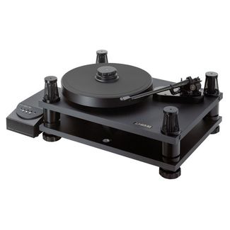 Британская компания SME Limited позиционирует свою топовую модель 30/12 как проигрыватель, который сможет полностью раскрыть потенциал ее тонармов серии V-12.Флагман обладает рекордным весом около 50 кг и является увеличенной и утяжеленной копией модели 30/2. Его стол имеет конструкцию, состоящую из двух массивных алюминиевых платформ. Нижняя платформа SME Model 30/12 опирается на поверхность посредством четырех антивибрационных регулируемых ножек, а верхняя подвешивается к ее четырем колоннам, выполняющим функции жидкостных демпферов, с помощью легкозаменяемых резиновых колец (по 15 штук на каждую). Поэтому проблем с резонансами и вибрациями этот проигрыватель практически не испытывает.Бесщеточный трехфазный двигатель оснащен мощной системой 8-полюсных неодимовых магнитов. Он крепится к нижней части стола и имеет три встроенных датчика Холла. Информация о скорости вращения считывается с датчиков и поступает в находящийся в отдельном корпусе микропроцессор, который производит настройку в соответствии с одним из требуемых значений – 33,3, 45 или 78 об/минуту. Там же имеются кнопки выбора скорости и соответствующая индикация. В этом же корпусе находится блок питания. Мотор передает крутящий момент на ступицу опорного диска с помощью резинового ленточного пассика. Опорный диск, оснащенный несъемным матом, выполненным из материала Isodamp, весит 7,5 кг и имеет диаметр в 330 мм. Он надевается на шпиндель, выполненный из закаленной стали и прошедший точную обработку. Материалом для муфты основного подшипника служит синтерированная бронза. В комплекте есть клэмп, который навинчивается на ось шпинделя и прижимает виниловую пластинку к мату.Саунд SME Model 30/12 можно назвать эталонным без каких-либо оговорок. При установке соответствующих по классу головки звукоснимателя и тонарма этот аппарат способен передать все нюансы записанного на виниловом диске аудиоматериала с точностью швейцарских часов. Единственное условие, о котором не следует забывать – это наличие высококачес
