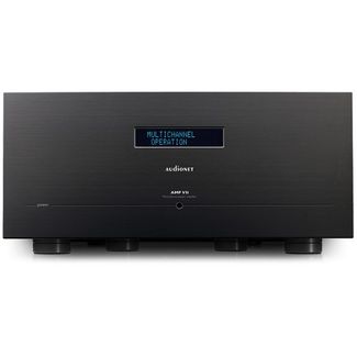 Оконечник Audionet AMP VII создан для работы в составе домашнего кинотеатра самого высокого уровня и обеспечивает качественное усиление вплоть до 7.1-канальной конфигурации. Модель выдает 150 Вт на канал при 8 Ом и 250 Вт на канал при 4 Ом.Массивный корпус аппарата опирается на 6 ножек и весит 58 кг, а его толстые алюминиевые панели препятствуют проникновению внешних помех. Фронтальная 10 мм панель содержит люминесцентный 2-строчный дисплей и кнопку, которая подает питание, переводит усилитель в режим standby и позволяет изменять его настройки в меню. Выключатель питания вынесен на днище корпуса.Для сохранения качественных характеристик Audionet AMP VII при любых условиях работы применяется технология ультралинейного усиления ULA. На борту имеются 7 съемных усилительных модулей, каждый из которых оснащен тороидальным силовым трансформатором мощностью в 650 ВА и шестью конденсаторами общей емкостью в 50000 мкФ. Благодаря такой конструкции удается минимизировать взаимное влияние каналов друг на друга. Входные секции представляют собой двойные дифференциальные предусилители, построенные на быстрых двойных монолитных транзисторах и обеспечивающие развязку с выходными секциями. В выходном каскаде каждого из семи модулей установлено по четыре МОП-транзистора с активным управлением токами смещения. Искажения корректируются в режиме реального времени. Управляет функциями оконечника микропроцессор, который также обеспечивает защиту от перегрузки, перегрева, самовозбуждения и других факторов. В Audionet AMP VII используются два гнезда для двух силовых кабелей.В сигнальных цепях нет вносящих искажения электромеханических элементов и разделительных конденсаторов. С целью сокращения путей прохождения сигнала и понижения искажений на ВЧ применяется поверхностный монтаж. Задействованы комплектующие премиум-класса, в т.ч. аудиофильские электролитические конденсаторы, сердечник которых выполнен из шелка. Для разводки применен кабель с проводниками из сплава золота с серебром. Аппара