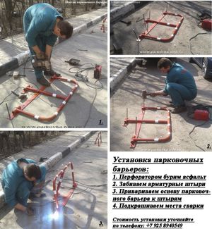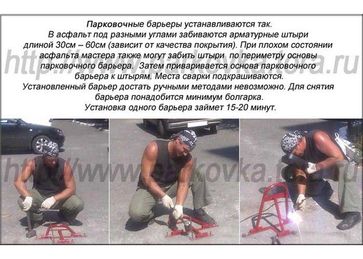 Изготовление парковочных барьеров, складных столбиков и т.п для ограничения въезда на паркоместо, тротуар, территорию.Парковочные барьеры устанавливаются так. В асфальт под разными углами забиваются арматурные штыри длиной 30см – 60см (зависит от качества покрытия). При плохом состоянии асфальта мастера также могут забить штыри по периметру основы парковочного барьера. Затем приваривается основа парковочного барьера к штырям. Места сварки подкрашиваются. Установленный барьер достать ручными методами невозможно. Для снятия барьера понадобится минимум болгарка. Установка одного барьера займет 15-20 минут.