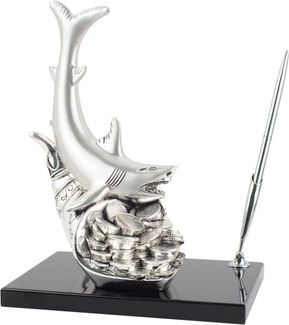<p>Конечно, Вы слышали выражение "Акула бизнеса". Как правило, так характеризуют опытных, успешных бизнесменов, проводящих агрессивную политику.</p> <p>Этот настольный прибор из серебра не только украсит стол, но и будет являться своеобразной наградой. Ведь получить звание "Акула бизнеса" очень непросто.<br /><br />Цвет: черный,серебристый<br /><br />Размер товара: 18 x 13 x 23<br /><br />Материал товара: полирезина покрытая серебристой краской, дерево, металл</p> Наличные, безнал., карты, эл. деньги, юр. лица Возможен самовывоз. Есть доставка.
