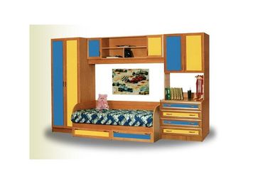 Габариты детской комнаты: ШхВхГ 3400х2000х840мм. Материалы и фасад: высококачественные ЛДСП и МДФ, возможен зеркальный фасад Поэлементный заказ: невозможен Исполнение в зеркальном отображении: возможно Шкаф закрытый: платяное отделение с штангой и полкой под головные уборы Тип шкафа: распашной Рабочее место: стола нет Цвет исполнения: 8 цветов, также возможно исполнение без цветных вставок Кровать: входит в стоимость, возможны нестандартные размеры Размер спального места: 80Х190, 90Х190 Комплектация матрасом: возможна и с матрасом и без матраса Доставка: доставка в разобранном Сборка: 10%