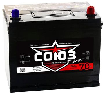 - Аккумулятор автомобильный Союз Asia 301070 6СТ-70 обр. (80D26L) 261x173x225 по выгодной цене 4 300 р. руб.;