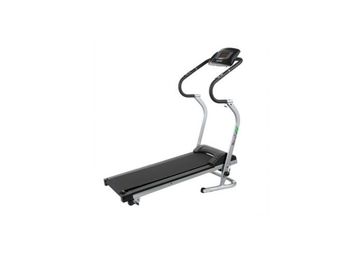 Складная механическая беговая дорожка с ременной системы нагрузки — Двойной тяжелый маховик для ровного хода — Угол наклона: три позиции - меняются вручную — Датчики измерения пульса на поручнях — Компьютер: ЖКД с одним большим информационным окном: скорость, время тренировки, пройденная дистанция, расход калорий, частота пульса, сканирующий режим всех параметров тренировки — Транспортировочные ролики