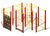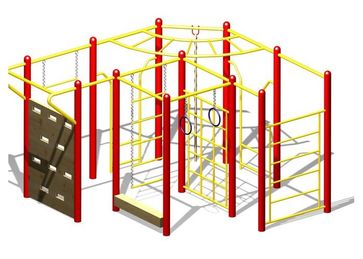 Комплекс спортивный КС-5Размеры: 3,50х 4,15 м. Высота 2,5 м. В комплекс спортивный КС-5 входят: а) рукоход сектор б) перекладина-канат, в) перекладина -кольца, г) перекладина - лесенка на цепях, д) турник (2 шт), е) стойка двойная – 2шт., ж) стенка шведская, з) стойка двойная «решетка», и) стойка двойная «бум», к) стойка двойная «стена», л) турник на цепях . Зона безопасности 6,5х 7,15 м.Общие характеристики поставляемого спортивного комплекса. Стойки комплекса изготовлены из трубы стальной диаметром 102 мм. Установка: глубина закопки стоек и приставных элементов 400 мм с последующим бетонированием (бетон М300). Элементы комплекса выполнены из круглой стальной трубы диаметром 27мм; 33,5 мм и 48 мм. Цепи круглозвенные оцинкованные, канат диаметром 30 мм х/б. Бум и стена выполнены из древесины хвойных пород. Крепёж оцинкован и снабжен предохранительными колпачками. Покрытие: металл - полимерно-порошковая краска, глянцевая; дерево – тонотекс, лак. Краска устойчива к сложным погодным условиям, истиранию, действию ультрафиолета. Цветовая гамма: красный, желтый (белый, синий). Спортивный комплекс комплектуется техническим паспортом, в котором указано назначение, заводской номер, правила безопасной эксплуатации и схемы сборки.