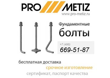 Компания ООО «ПРО МЕТИЗ» предлагает изготовление фундаментных, анкерных болтов на собственном производстве 1.1 по ГОСТ 24379.1-80, ГОСТ 24379.1-2012. Из Российской сертифицированной стали: ст20, ст3пс2, ст3сп2 ст3кп2, С245, С345, ст35, ст45, 35Х, 40Х, 09г2с.Приобретая у нас, Вы получаете гарантию качества по низкой стоимости. При отгрузке предоставляется сертификат качества на сталь и паспорт качества на изделие.Сроком изготовления от 1 часа.Так же предлагаем изготовление закладных изделий по чертежу заказчика, фундаментных блоков, сварных конструкций и анкерных плит.Компания ООО «ПРО МЕТИЗ» сотрудничает с логистическими компаниями, что позволяет в кратчайшие сроки доставить товар по РФ и СНГ.Доставку по Москве и Московской области осуществляем бесплатно.Ознакомится с нашей продукцией, Вы можете в каталоге на нашем официальном сайте