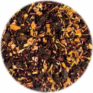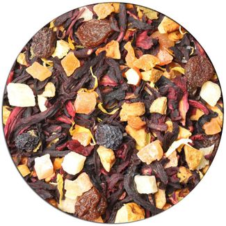 Гибискус, кусочки ананаса, папайи, яблока, изюм, кожура апельсина, листья смородины. None