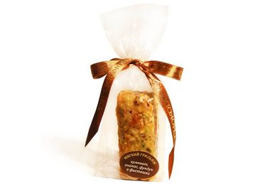 Мягкий грильяж с кумкватом, ананасом, фундуком и фисташками. Состав: сахар, мед натуральный, кумкват сушеный, фисташки жареные, фундук жареный, цукат ананаса, сушеный лимон, глюкозный сироп, масло сливочное.