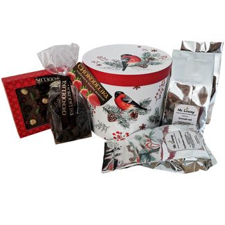 - Подарочный набор чая, шоколада и конфет на Новый год "Снегири" в круглой коробке по выгодной цене 1 360 р. руб.;