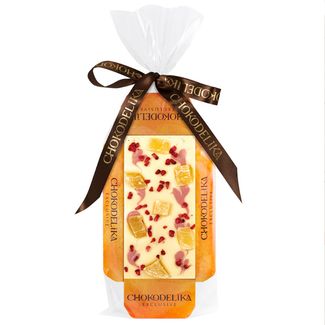 Шоколад белый, узорный с цукатами ананаса и сушеной малины.