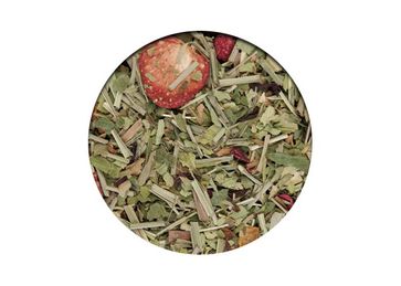 Основные характеристики: листья клубники, лимонная трава, мята перечная, цветы гибискуса, кусочки яблока, дольки клубники, красная смородина, кусочки ананаса.