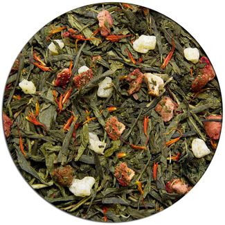 Зеленый китайский чай Сенча, кусочки ананаса и клубники, лепестки сафлора. None