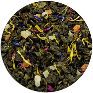 Зеленый китайский чай ганпаудер, кусочки ананаса, клубники, лепестки розы, календулы, василька. None