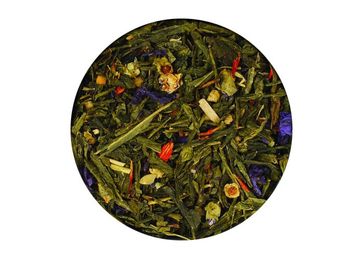 Китайский зеленый чай Сенча с добавлением грильяжа, меда, лепестков мальвы, цветков сафлора и кусочков миндаля. None