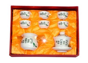 Чайный сервиз "Белый стих" (Гайвань, Ча Хай(сливник), 6 пиал). Гайвань (Включает в себя саму чашку, крышку и блюдце)-100мл, Ча хай (сливник)-150 мл, 6 чашек-25 мл. None