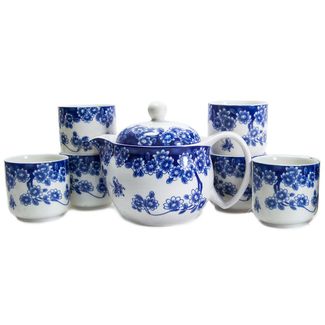 Фарфоровый чайный сервиз с рисунком в виде цветов, выполненный в традиционных лазоревых тонах.