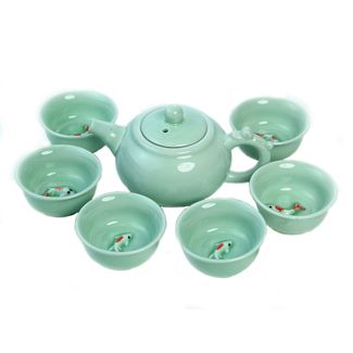 Фарфоровый сервиз из 7 предметов светло-зеленого цвета с 3D карпами на донышке. None