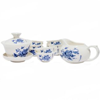 Чайный сервиз из фарфора, имеет рисунок выполненный в традиционных лазоревых тонах.