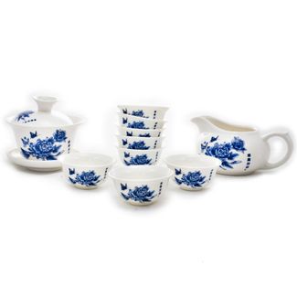 Чайный сервиз сделанный из фарфора, имеет рисунок выполненный в традиционных лазоревых тонах.
