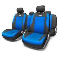 Цвет: синий с черным. Количество предметов в комплекте: 11. Толщина поролона: 5 мм. Вставка и боковины из велюра «под замшу». 3 молнии в спинке заднего сиденья. 5 подголовников. Классическая комплектация. None