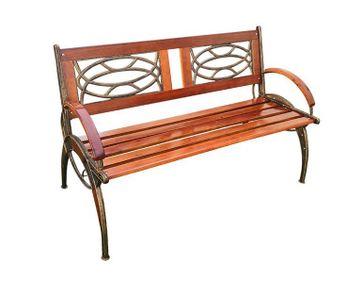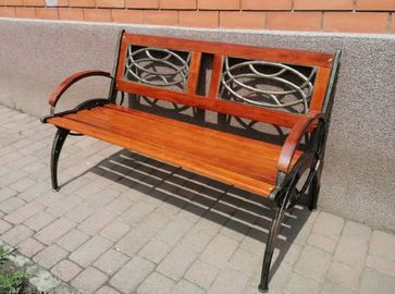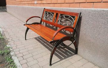 Небольшая модель предназначена скорее для частного использования, конструкция из состаренного чугуна и дерева оттенка палисандра подойдет для дачи. На такой скамье удобно отдыхать в дружеской компании.