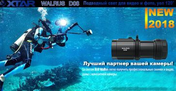 Фонарь подводный XTAR D08 - Новинка 2018 года, предназначен для погружения на глубину до 100 метров подводу. Кстар D08 WALRUS можно использовать как обычный фонарь для дайвинга, но он специально спроектирован для подводной фото и видео съемки!